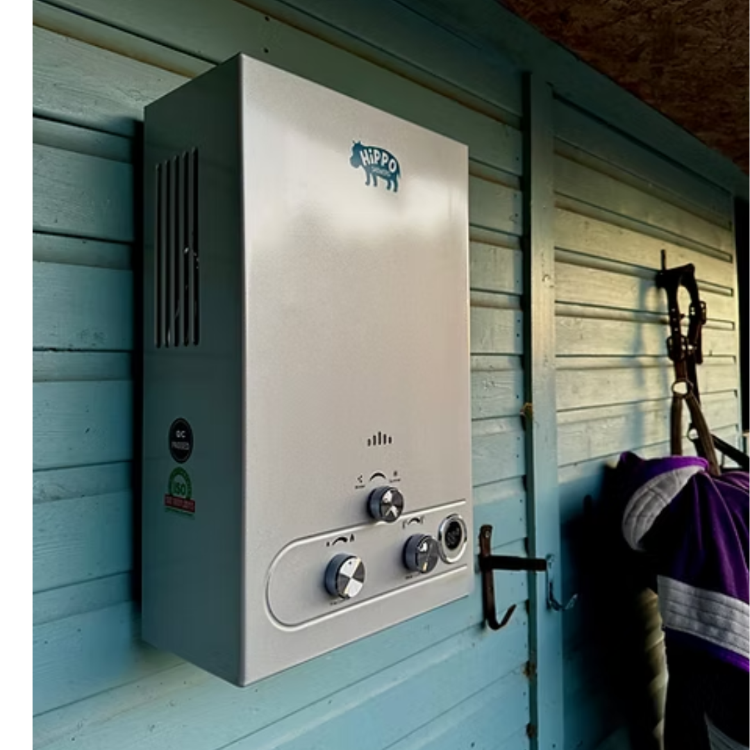 • Metallic water heater with 'Hippo' branding on a wooden wall.