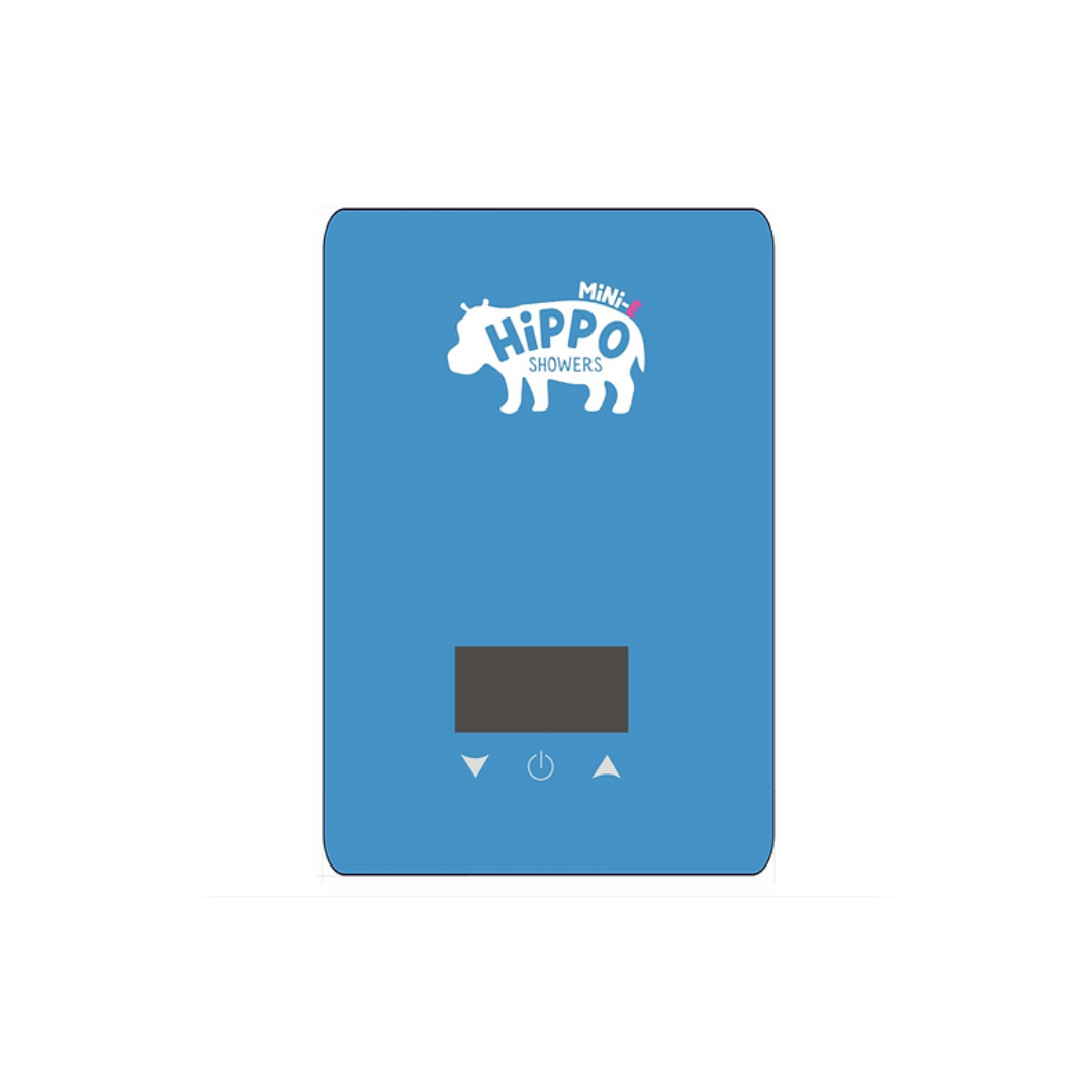 • Blue device with Hippo Showers logo on a white background